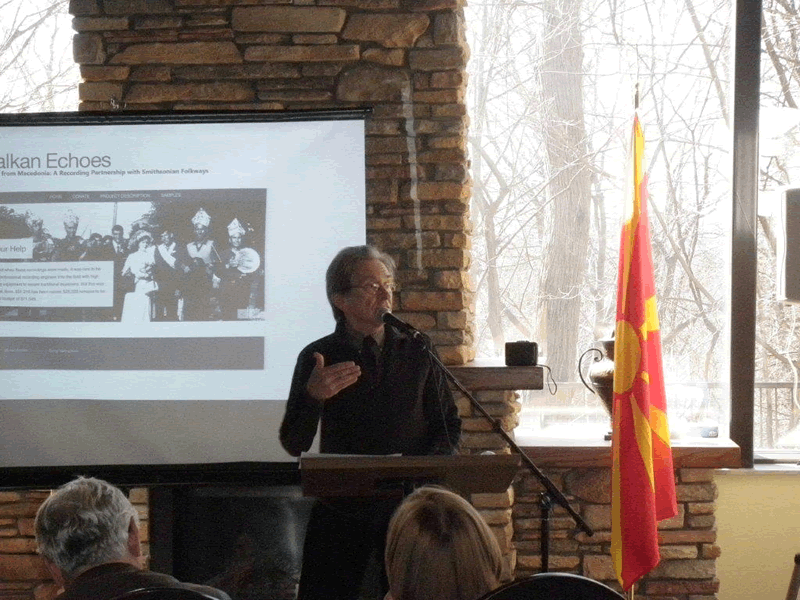 Mr. Koenig gave a very informative and passionate talk about his interest in Macedonian music and dance and his collaboration with the Smithsonian Institute to preserve the music there by producing a CD of his research and findings. He presented a video of photographs and music that will be included in the recordings he is making with the Smithsonian.