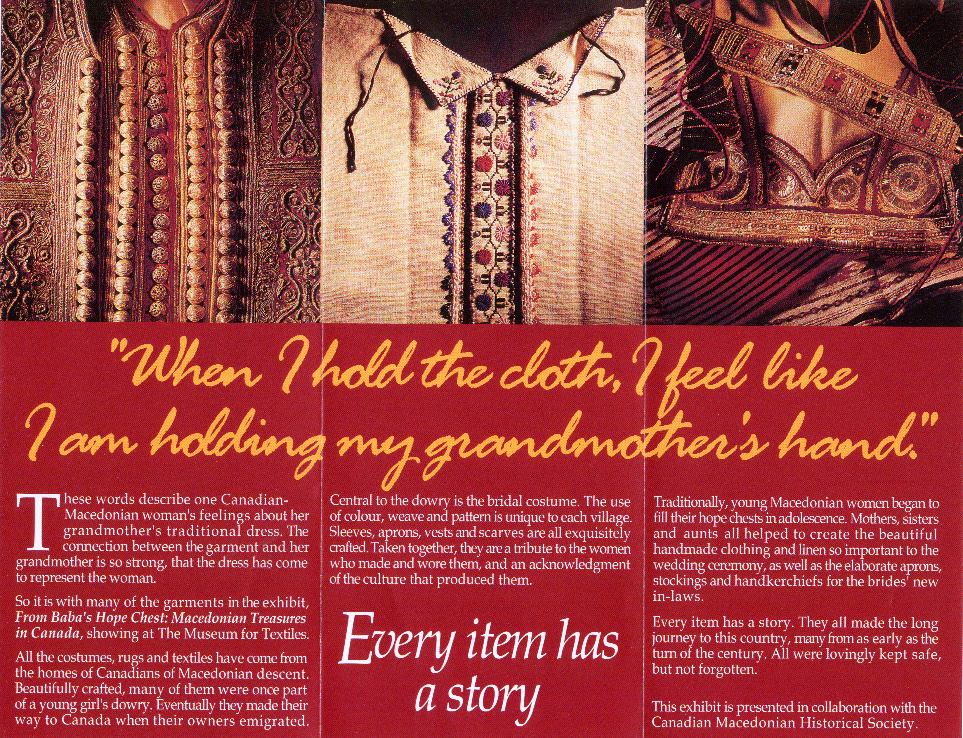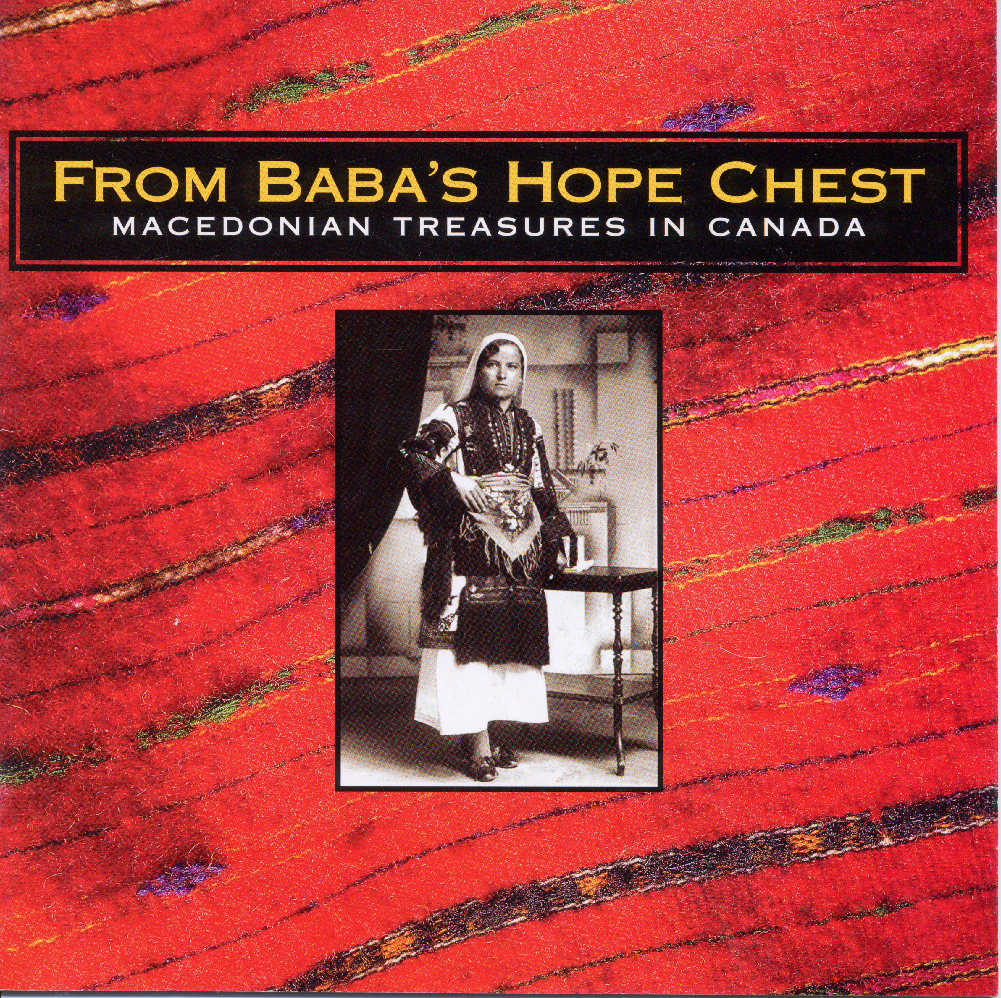 FROM BABA'S HOPE CHEST: Macedonian Treasures in Canada was an exhibition of traditional Macedonian clothing and textiles presented in collaboration with THE MUSEUM FOR TEXTILES and CMHS member Angela Wood who was Curator of the show. The exhibition ran from March 1 to October 15, 1995. It showcased a significant number of Macedonian costumes, rugs and textiles that came from the homes of Canadians of Macedonian descent. This was a joint effort between the the Museum for Textiles and the Canadian Macedonian Historical Society.